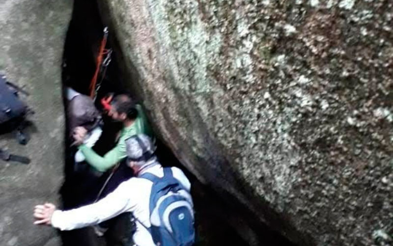 O primeiro ponto de descida foi em uma caverna com 5 metros de desnível. Ao longo do caminho, encontramos mais dois locais que utilizamos os equipamentos de escalada: o segundo, leva ao colo da montanha, onde realizamos um rapel de 30 metros e o último foi um corrimão (linha de vida) de quase 50 metros, onde dá acesso ao cume do Garrafão, Serra dos Órgãos.