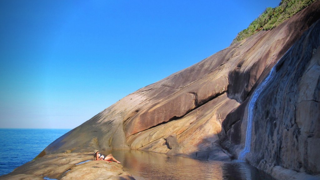 Uma linda cachoeira que forma uma piscina natural e deságua no mar, vista de outro ângulo a ilusão infinita se funde à paisagem e torna ainda mais incrível o lugar.